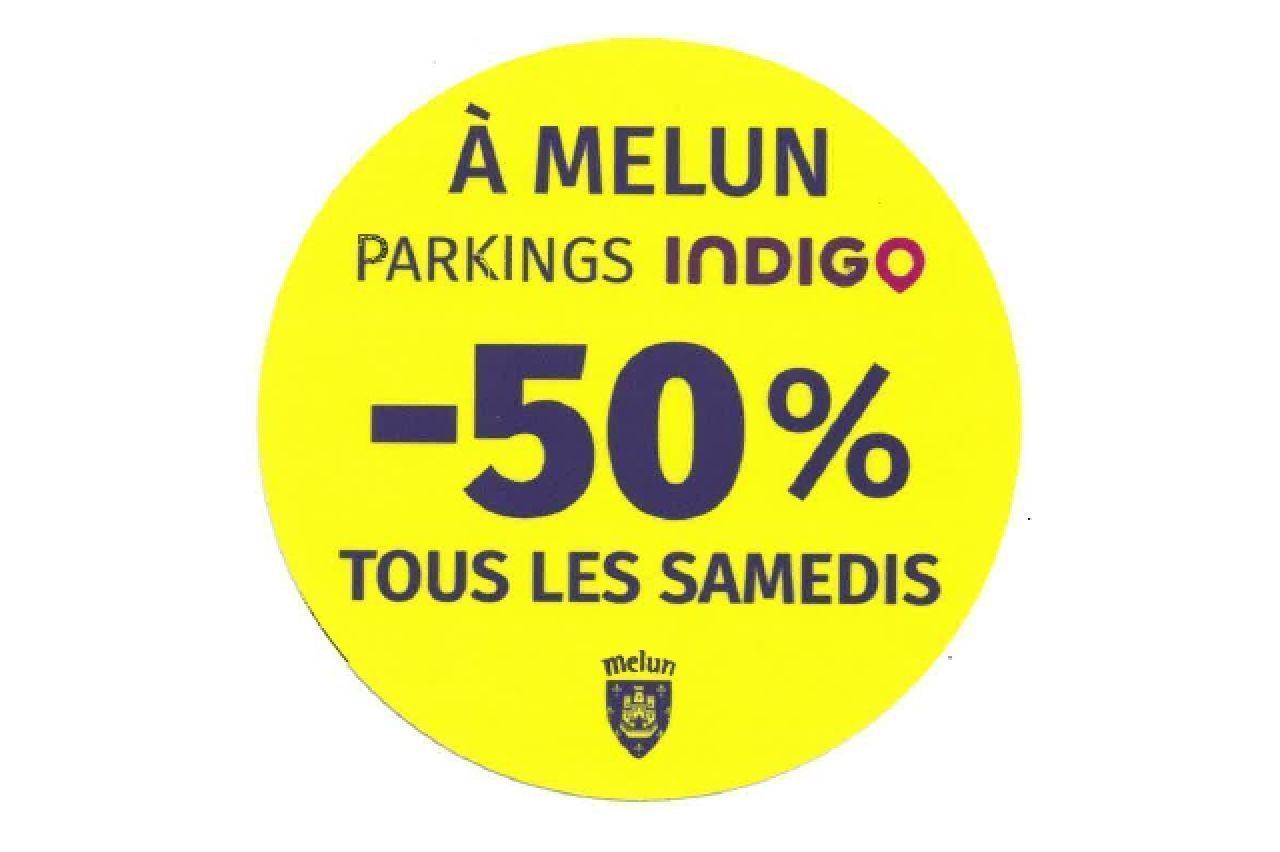 Opération "A Melun, le samedi c'est moitié prix !  les 52 samedis de l'année, toute la journée, dans 6 parkings Indigo du centre-ville : Porte de Paris (380 places), Gambetta (161 place), Victor Hugo (233 places), Lebarbier (100 places), Praslin (134 places) et Gaillardon (360 places)